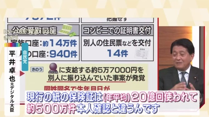 平井元デジタル大臣「紙の健康保険証は使いまわしや外国人による不正利用がある。年間500万件差し戻しが起きているからマイナンバーカードとの一体化が必要」