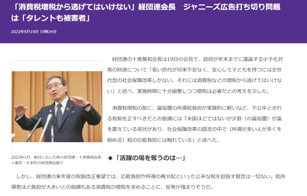 経団連の十倉会長「若い世代が将来不安なく暮らすために消費税増税から逃げてはいけない」