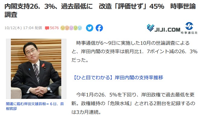 内閣支持26.3%、過去最低に 改造「評価せず」45% 時事世論調査