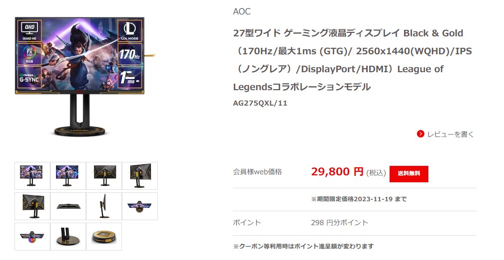 ジョーシンの阪神優勝セールで27インチ・170Hz・WQHDモニタ「AOC AG275QXL/11」が2万9800円 安いけどデザインがクソダサい