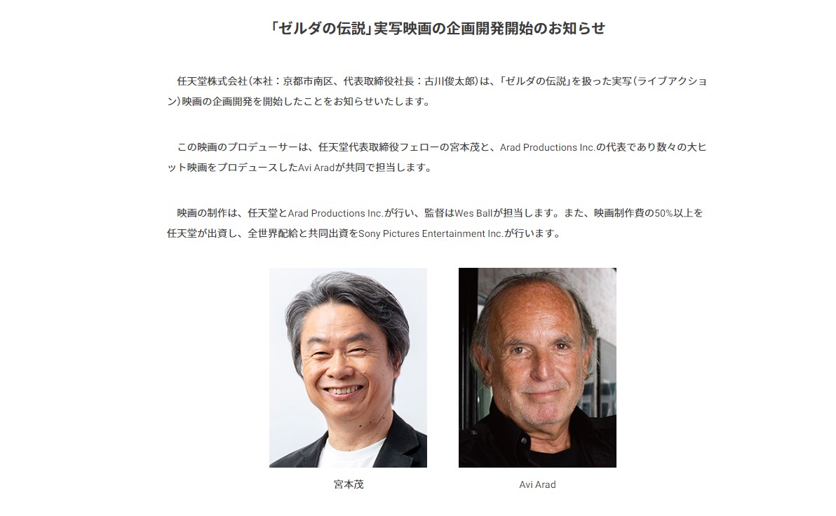 宮本です。「ゼルダの伝説」の実写映画の企画を数々のヒット作を手がけたAvi Aradさんと長年進めてきました。今回Aviさんに共同プロデューサーをお願いし、任天堂自ら制作に深く関与して正式に開発をスタートしました。完成まで時間がかかりますが、楽しみにお待ちください。