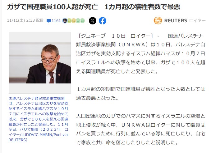 ガザで国連職員100人超が死亡 1カ月超の犠牲者数で最悪