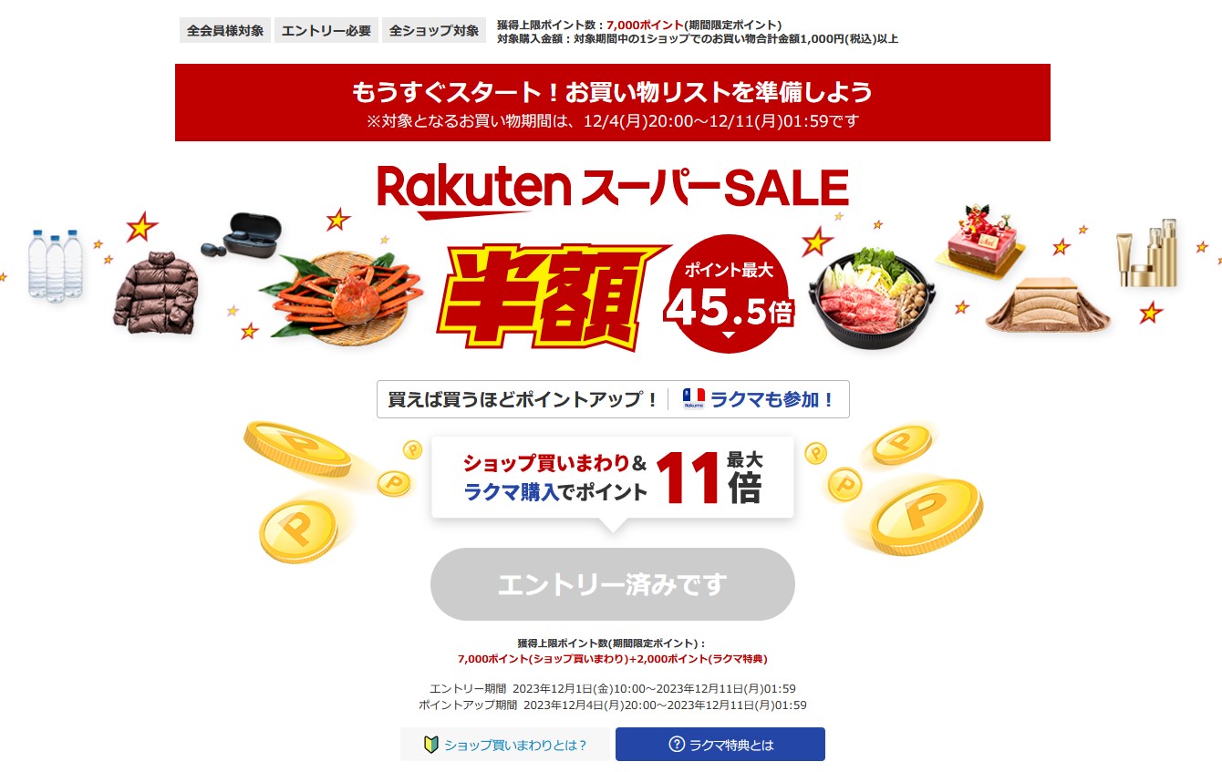 2023/12/04 20:00:00 – 2023/12/11 01:59:59 楽天スーパーSALE