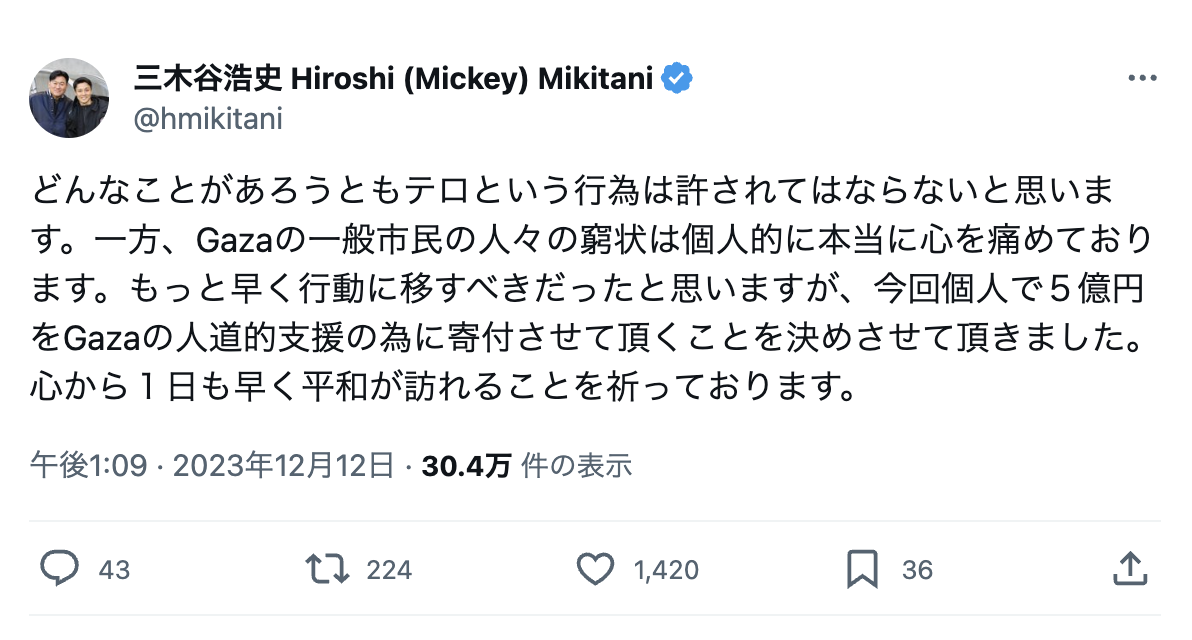 どんなことがあろうともテロという行為は許されてはならないと思います。一方、Gazaの一般市民の人々の窮状は個人的に本当に心を痛めております。もっと早く行動に移すべきだったと思いますが、今回個人で5億円をGazaの人道的支援の為に寄付させて頂くことを決めさせて頂きました。…