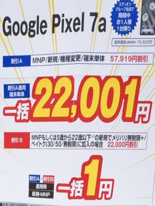 ソフトバンクの一部ショップ、12月26日まで「Pixel 7a」を一括1円or1480円で販売中 27日から「スマホ割引規制改正」