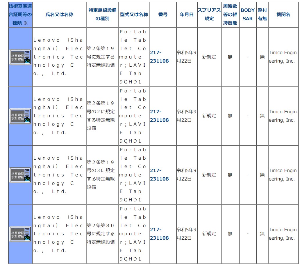 総務省のサイトで Y700 2023 の NEC 版 9QHD1 が 9 月に技適通過したのが確認できるね。