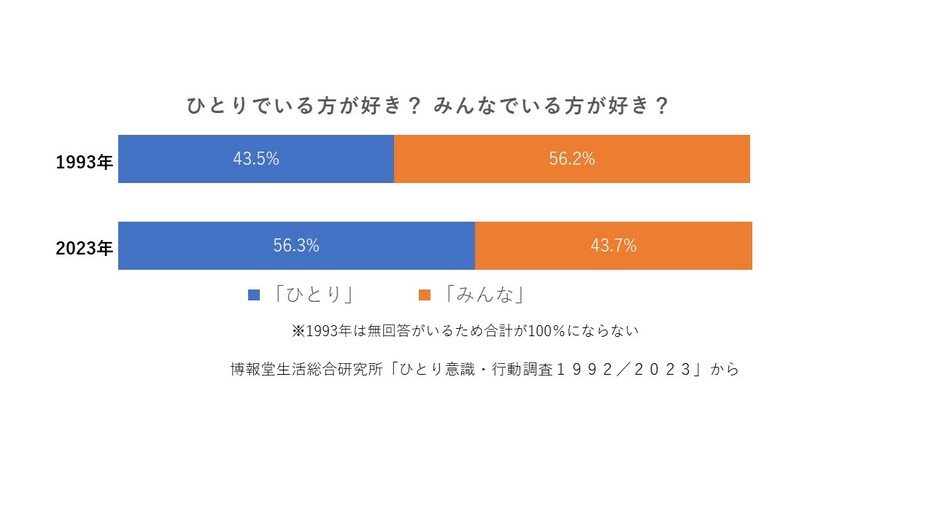 「一人が好き?」「みんなでいるほうが好き?」一人が多数派に、30年で逆転