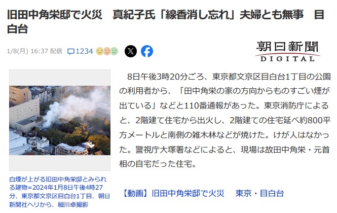 旧田中角栄邸の火事、真紀子が原因だった「ぜんぶまる焦げ。お仏壇にお線香をあげて消し忘れた。発見したのも私」