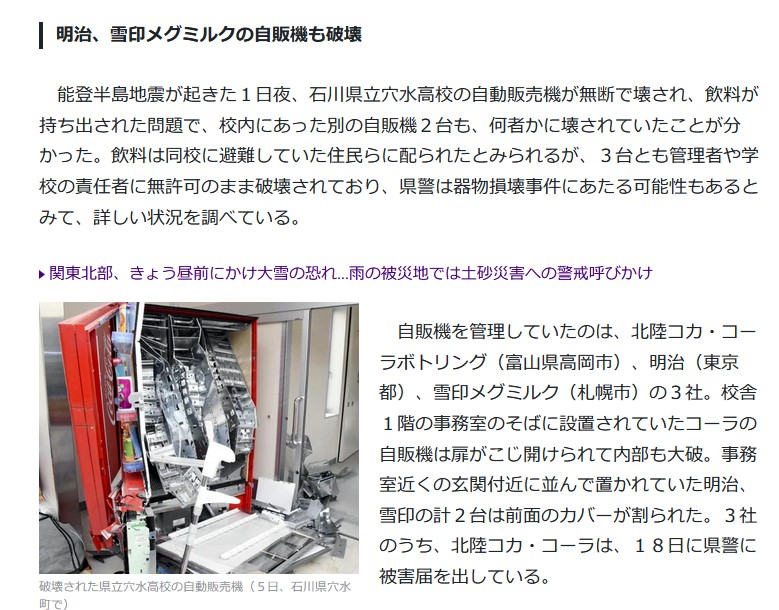 地震発生時に壊された穴水高校の自販機、カギ開ければ無料で取り出せる「災害支援型」だった…
