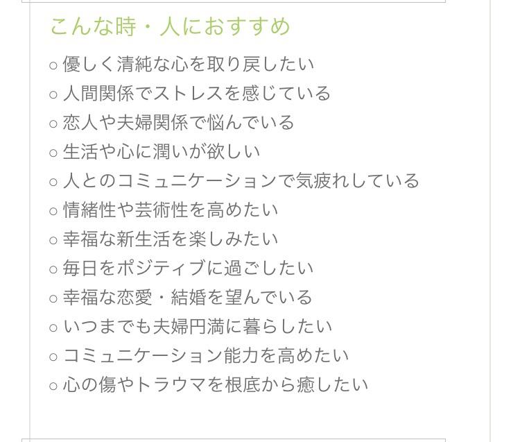 ・優しく清純な心を取り戻したい ・人間関係のストレス ・生活や心に潤い ・気疲れ ・情緒性や芸術性 ・毎日ポジティブ ・コミュニケーション能力 ・トラウマを癒やしたい