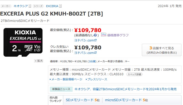 キオクシアの2TB microSDカードがついに発売 価格は10万9780円