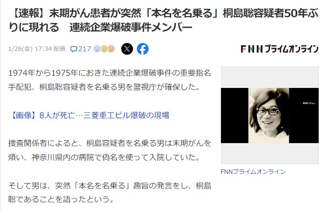 【速報】末期がん患者が突然「本名を名乗る」桐島聡容疑者50年ぶりに現れる 連続企業爆破事件メンバー