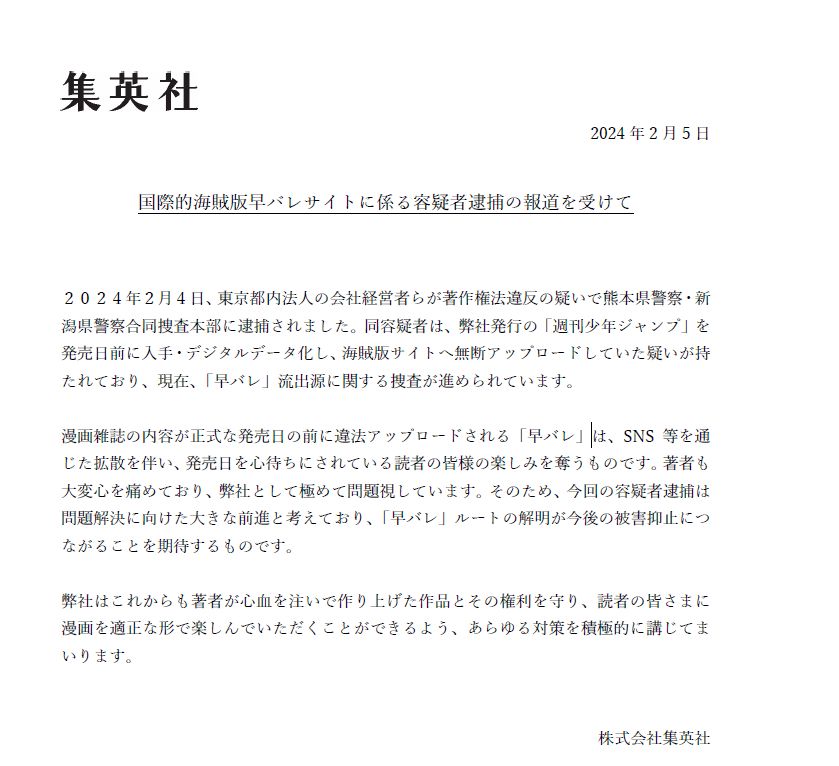 集英社、少年ジャンプ早バレ師逮捕について声明「”早バレ”問題解決に向けた大きな前進」