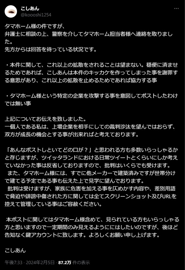 タマホームとトラブルになっていたこしあん氏、和解を提案した模様 次は誹謗中傷してきたX民とバトルへ