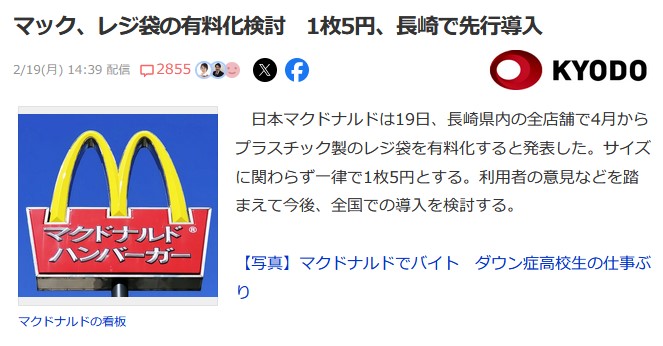マック、レジ袋の有料化検討 1枚5円、長崎で先行導入