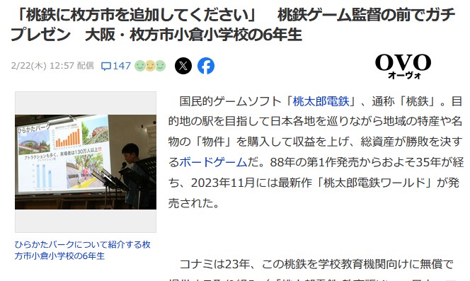 大阪・枚方市小倉小学校の6年生「桃鉄に枚方市を追加してください」とガチプレゼン 桃鉄ゲーム監督「プレゼン浅すぎ、無理です」