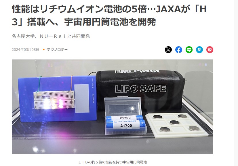 JAXA・名古屋大学・NU-Rei、リチウムイオン電池のエネルギー密度5倍の電池を開発してしまう 価格はリチウムイオン電池の3分の1から4分の1らしい