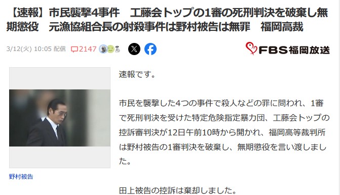 【速報】市民襲撃4事件 工藤会トップの1審の死刑判決を破棄し無期懲役 元漁協組合長の射殺事件は野村被告は無罪 福岡高裁