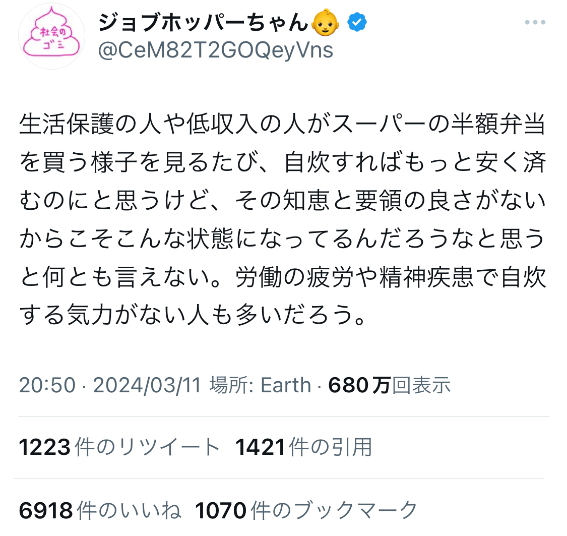 生活保護の人や低収入の人がスーパーの半額弁当を買う様子を見るたび、自炊すればもっと安く済むのにと思うけど、その知恵と要領の良さがないからこそこんな状態になってるんだろうなと思うと何とも言えない。労働の疲労や精神疾患で自炊する気力がない人も多いだろう。