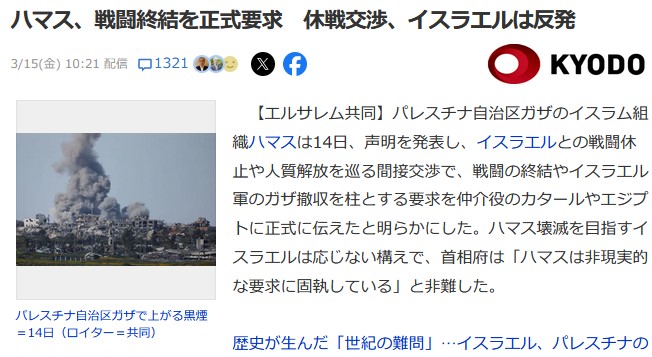 ハマス、戦闘終結を正式要求 休戦交渉、イスラエルは反発