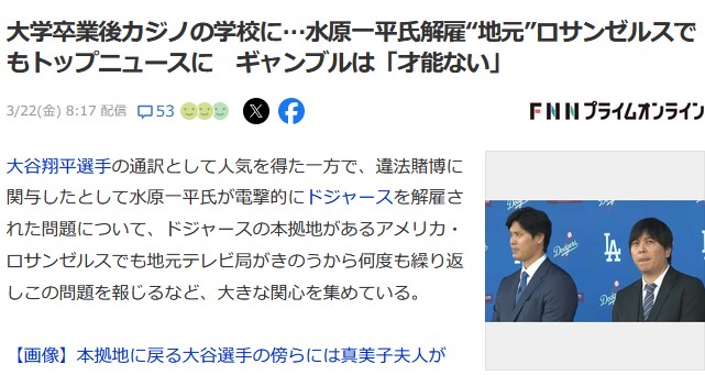 大学卒業後カジノの学校に…水原一平氏解雇“地元”ロサンゼルスでもトップニュースに