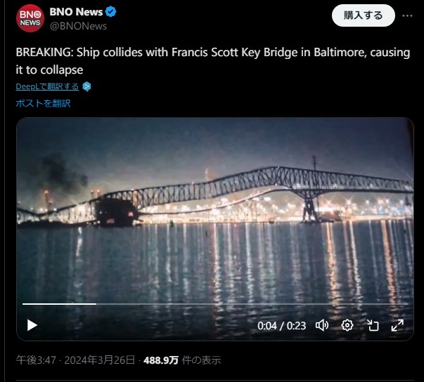 アメリカ・メリーランド州ボルチモアの大きい橋にコンテナ船が衝突して橋が崩落