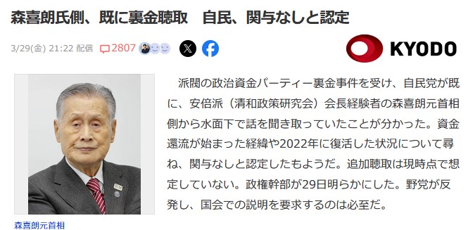 自民党「森元首相に裏金事件について聞いたら関与してませんでした。高齢だからこれ以上聞く必要もない」