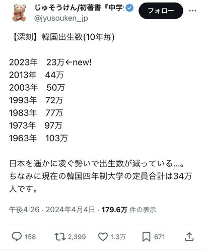 ちなみに現在の韓国四年制大学の定員合計は34万人です。— じゅそうけん/初著書『中学受験 子どもの人生を本気で考えた受験校選び戦略』好評発売中 (@jyusouken_jp) April 4, 2024