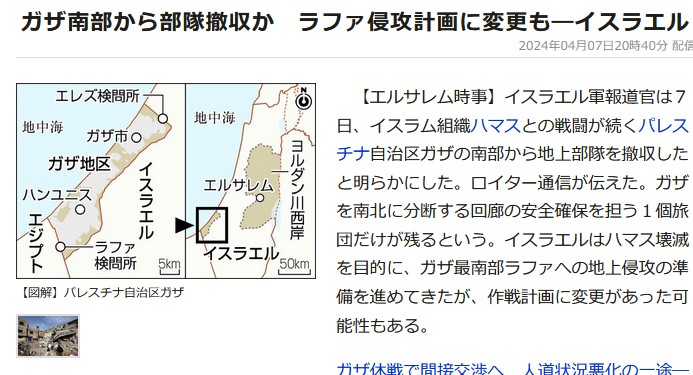 ガザ南部から部隊撤収か ラファ侵攻計画に変更も―イスラエル