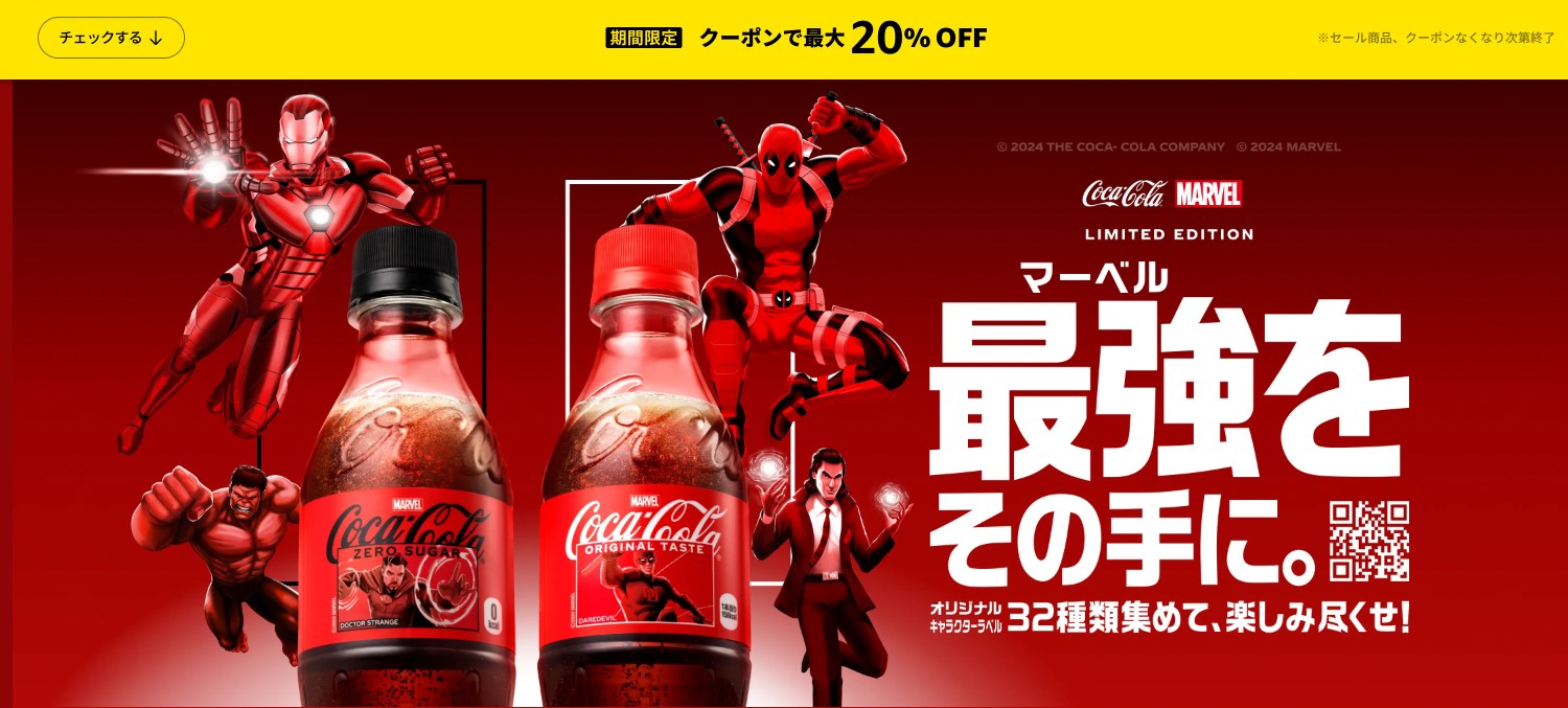 Amazon、コカ・コーラ20%オフクーポン配布中 マーベルとコラボしたオリジナルアイテムが当たるキャンペーンも開催