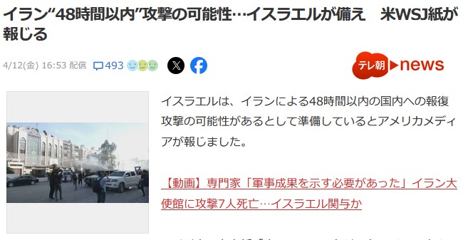 イラン“48時間以内”攻撃の可能性…イスラエルが備え 米WSJ紙が報じる