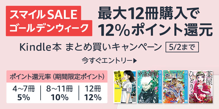 Kindle本まとめ買いキャンペーン 最大12冊購入で12%ポイント還元(5/2まで)