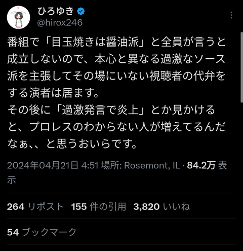 その後に「過激発言で炎上」とか見かけると、プロレスのわからない人が増えてるんだなぁ、、と思うおいらです。— ひろゆき (@hirox246) April 20, 2024