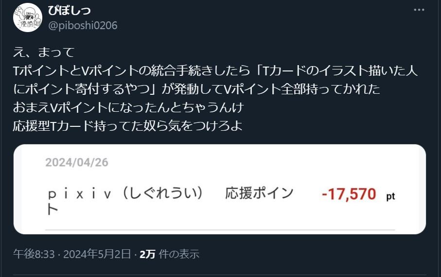 【悲報】応援型Tカード使ってた人、TポイントとVポイントの統合手続きをしたらポイント寄付が発動してVポイントを全て持っていかれる