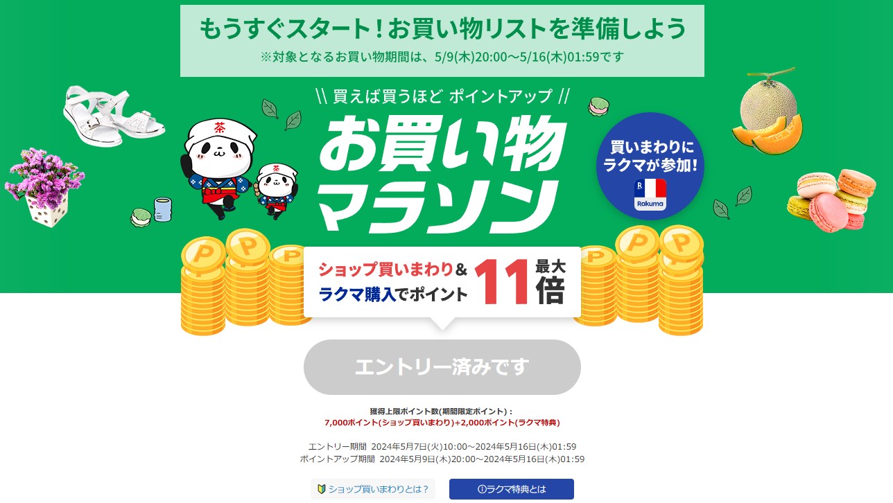 2024/05/09 20:00:00 – 2024/05/16 01:59:59 お買い物マラソン