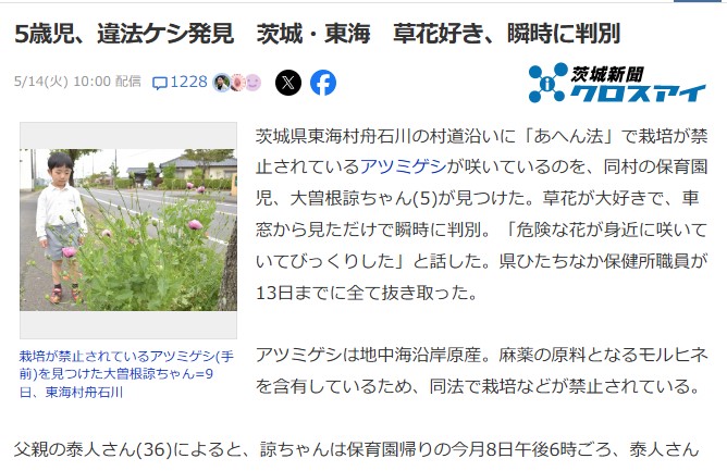 5歳児、違法ケシ発見 茨城・東海 草花好き、瞬時に判別