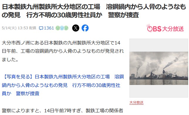 日本製鉄の工場で30歳男性社員行方不明→溶鋼鍋内から人骨のようなものが発見