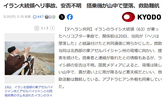 イラン当局「ライシ大統領が乗ったヘリコプターは墜落した」