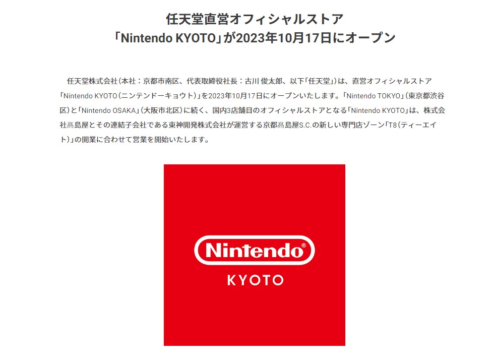 [おしらせ]任天堂直営オフィシャルストア「Nintendo KYOTO」のオープンが決定しました。京都髙島屋S.C.にて、2023年10月17日(火)開業予定です。