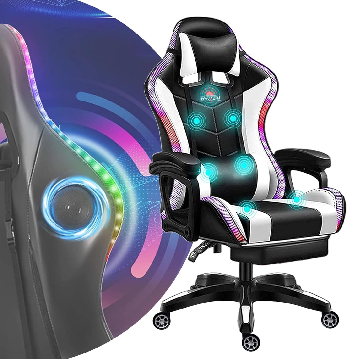 スピーカー付きゲーミングチェア フットレスト付き人間工学に基づいたコンピューターチェア LED RGBライト ハイバックミュージックビデオゲームチェア