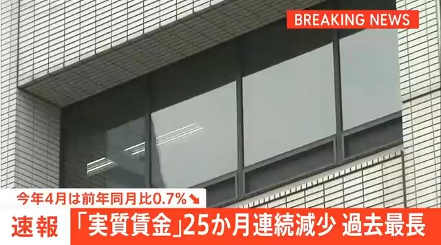 日本 4月の実質賃金0.7%減 過去最長の25カ月連続マイナス