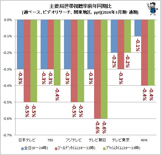 全局視聴率下落…主要テレビ局の直近視聴率実情(2024年3月期下期・通期)