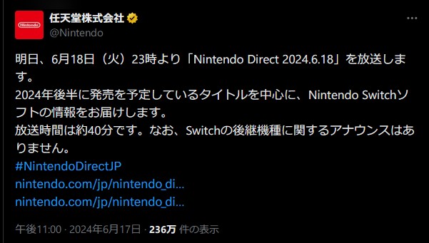 明日、6月18日(火)23時より「Nintendo Direct 2024.6.18」を放送します。
