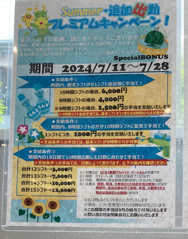 7月11日から28日までの間に15日10時間勤務で出勤すると12000円!!