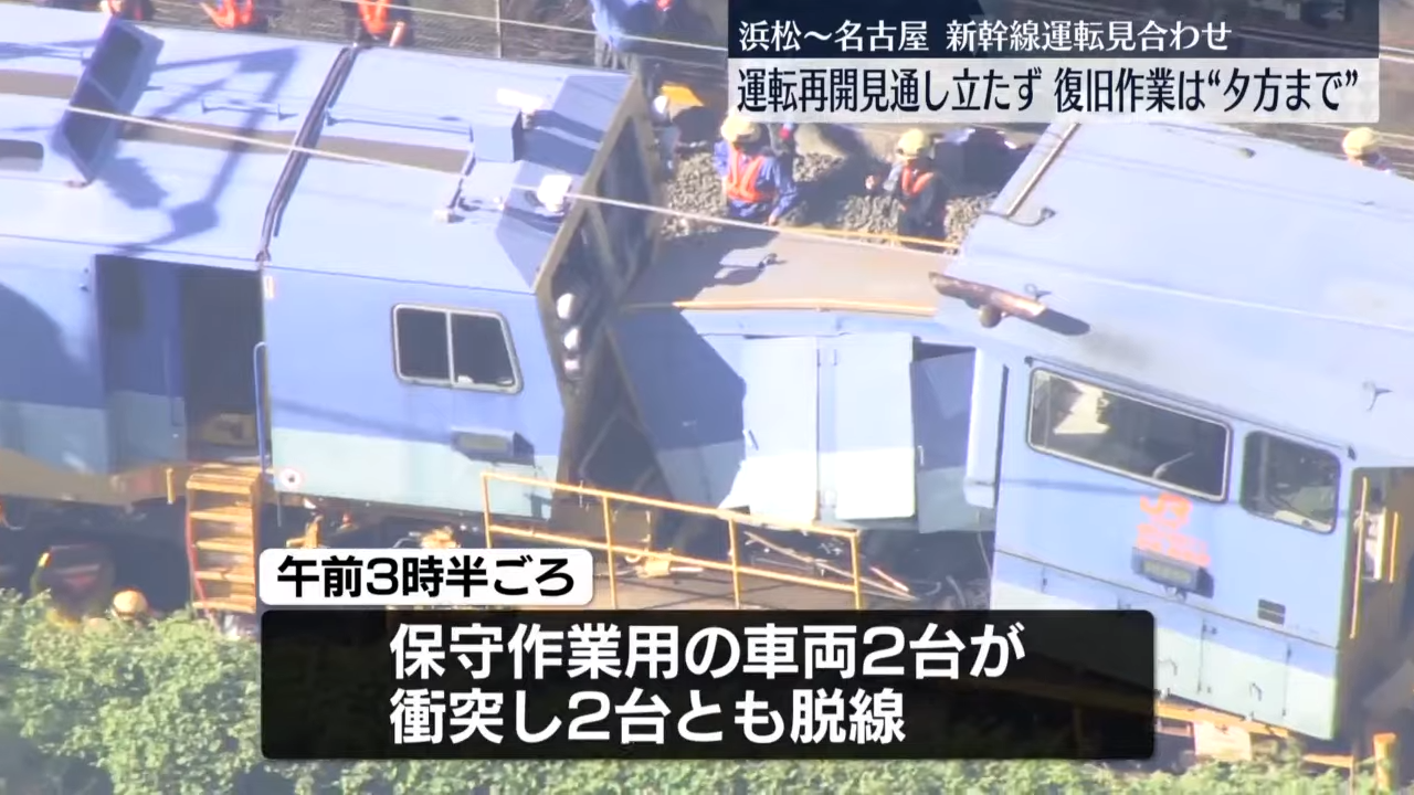 東海道新幹線、保守用の車両が衝突・脱線 本日中の運転再開見通し立たず