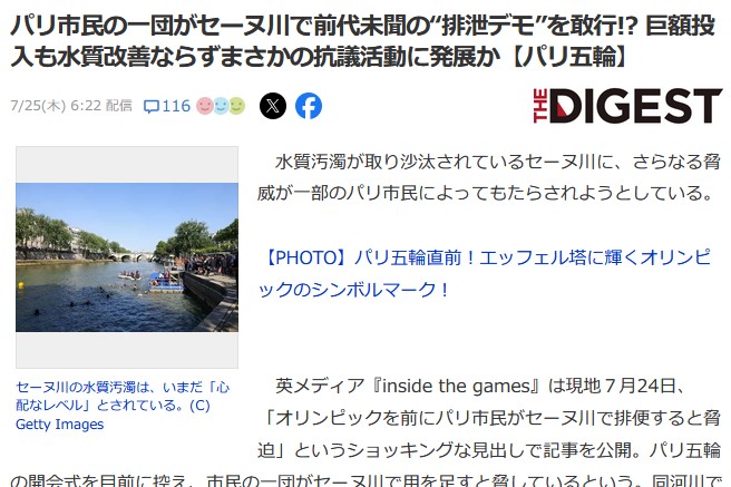パリ市民の一団がセーヌ川で前代未聞の“排泄デモ”を敢行!? 巨額投入も水質改善ならずまさかの抗議活動に発展か【パリ五輪】