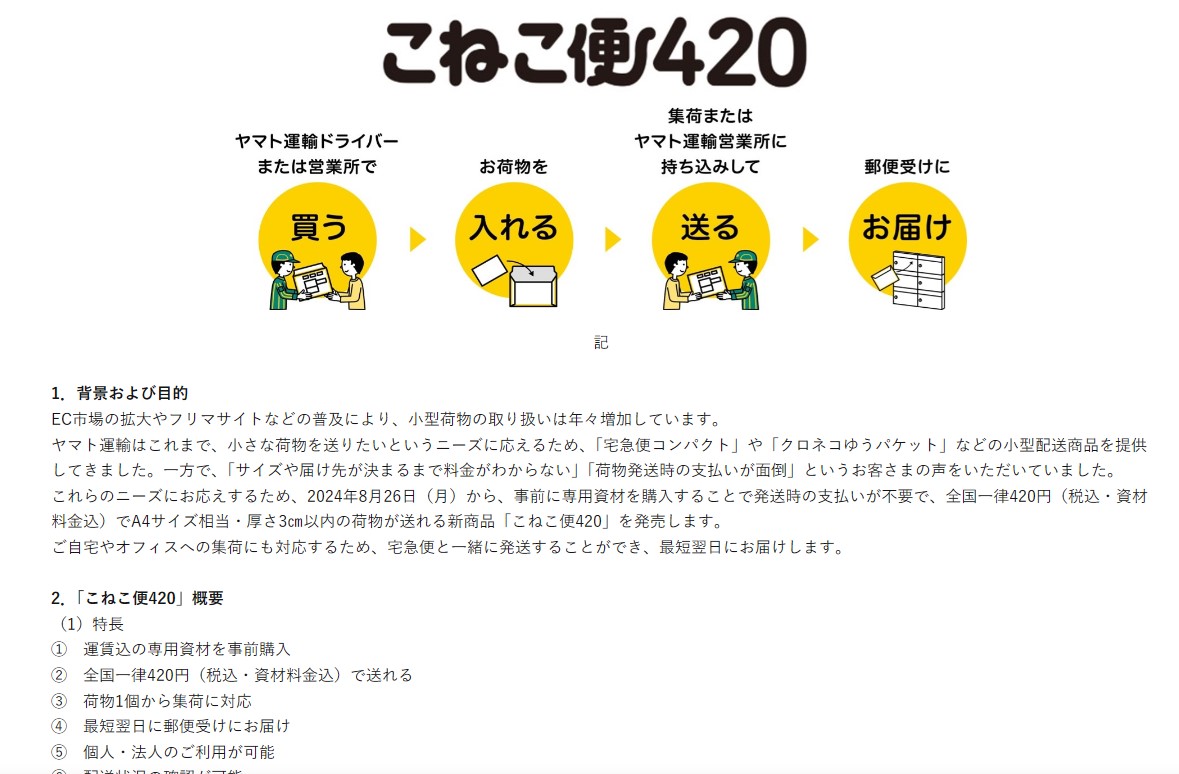専用資材を事前購入するだけで全国一律420円で荷物が送れる新商品「こねこ便420」を発売