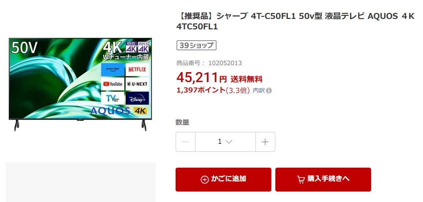 楽天市場でシャープの50インチ4Kテレビが45211円