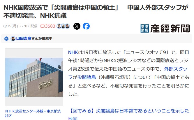 NHK国際放送で「尖閣諸島は中国の領土」 中国人外部スタッフが不適切発言、NHK抗議