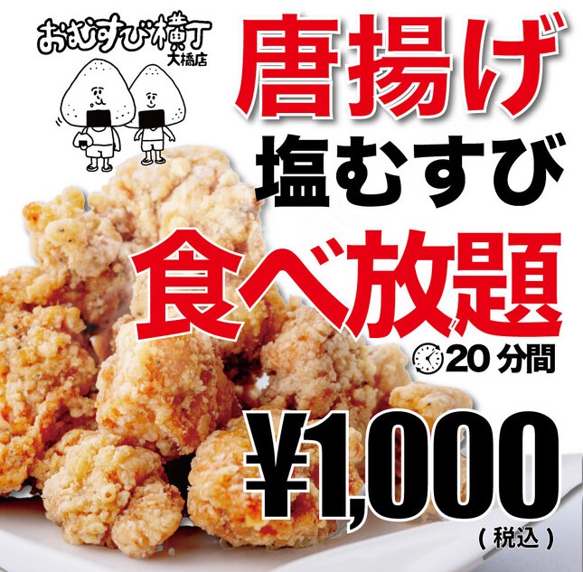 「おむすび横丁大橋店」、1000円で唐揚げと塩むすび20分間食べ放題を開始 唐揚げはオーダーしてから揚げるからアチアチ